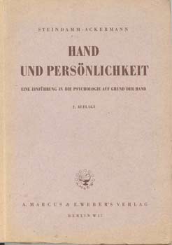 Steindamm, Hugo / Ackermann, Elsbeth: Hand und Persönlichkeit. Eine Einführung in die Psychologie auf Grund der Hand. Berlin, A. Marcus und E. Weber’s Verlag 1947. 2. verbesserte Auflage. Gr.-8°. Mit 13 Abb. (im Text) u. 65 Handbeispielen (auf 32 lose beiliegenden Taf.) 96 S. OKart.