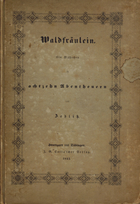 Waldfräulein. Ein Mährchen in achtzehn Abentheuern. Cotta’scher Verlag, Stuttgart und Tübingen 1843. XII, 169 S., 1 (w) OPp.