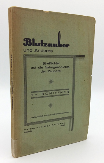Schiffner, Th[erese]: Blutzauber und Anderes. Streiflichter auf die Naturgeschichte der Zauberei. Verlag von Max Altmann, Leipzig 1930. Zweite, vielfach erweiterte und veränderte Auflage. 1 Bl. Vlgs.-Anz., VI, 148 S., 2 Bl. Vlgs.-Anz OKarton.