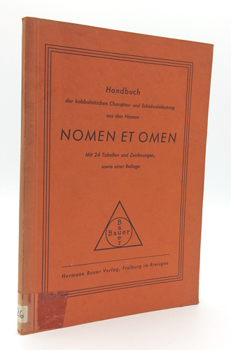 Nomen et Omen. Handbuch der kabbalistischen Charakter- und Schiksaldeutung aus den Namen. Hebräisches System der phonetischen Kabbalistik gepaart mit neuzeitlichen Erkenntnissen. Hermann Bauer Verlag, Freiburg im Breisgau 1952. Mit 24 Tabellen und Zeichnungen sowie einer Beilage. 101 S., 1 Bl. Vlgs.-Anz., 1 Bl. [Beilage] OKarton.