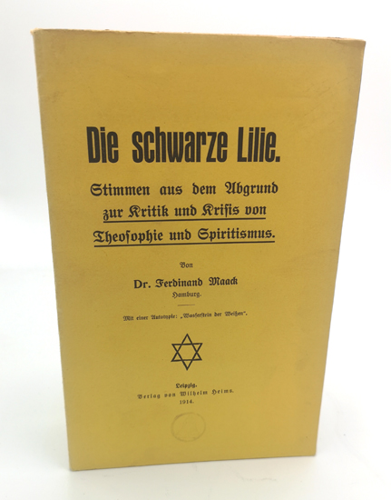 Maack, Dr. [med.] Ferdinand: Die schwarze Lilie. Stimmen aus dem Abgrund zur Kritik und Krisis von Theosophie und Spiritismus. Verlag von Wilhelm Heims, Leipzig 1914. Gr.-8°. Mit einer Autotypie: “Wasserstein der Weisen”. 1 Bl. (Frontispiz), 68 S. OKarton.