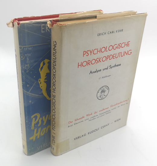 Kühr, Erich Carl: Psychologische Horoskopdeutung. Analyse und Synthese. Band I und II. Verlag Rudolf Cerny, Wien 1948 u. 1951. Mit (zusammen) 54 Abbildungen. Sämtliche Figuren zeichnete Richard Helmich. 321 S., 1 Bl. Vlgs.-Anz.; VIII, 420 S., 6 Bl. (Abbildungen) OHLwd. u. OLwd. Bde. mit Goldprägung.