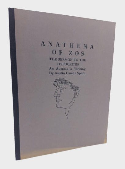 Spare, Austin Osman: Anathema of Zos. The Sermon to the Hypocrites. An Automatic Writing. Black Moon Publishing 1985. Facsimile Edition. 4°. [276 x 214 mm].With 2 drawings by Austin Osman Spare. S.[3]-20, [4] S. [so complete]. Illustrated original cardboard.