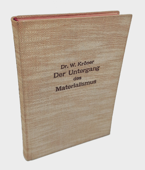 Kröner, Dr. med. Walther: Der Untergang des Materialismus und die Grundlegung des biomagischen Weltbildes. Richard Hummel Verlag, Leipzig 1939. 296 S., 1 Bl. (Inhalt), 3 Bl. Vlgs.-Anz., 1 mehrfach gefaltete Tafel. OLwd.