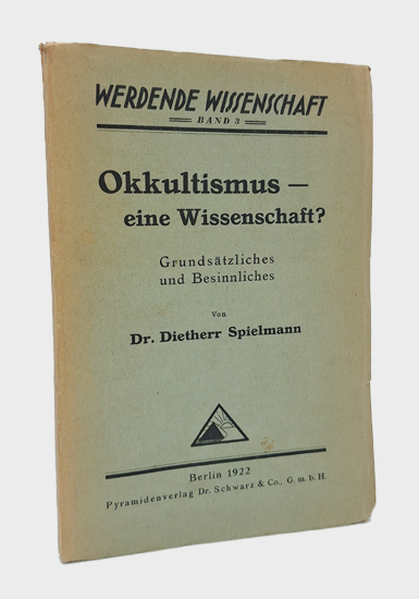 Spielmann, Dr. Dietherr: Okkultismus – eine Wissenschaft? Grundsätzliches und Besinnliches. Pyramidenverlag Dr. Schwarz & Co., G.m.b.H., Berlin 1922. 91 S. OKarton.