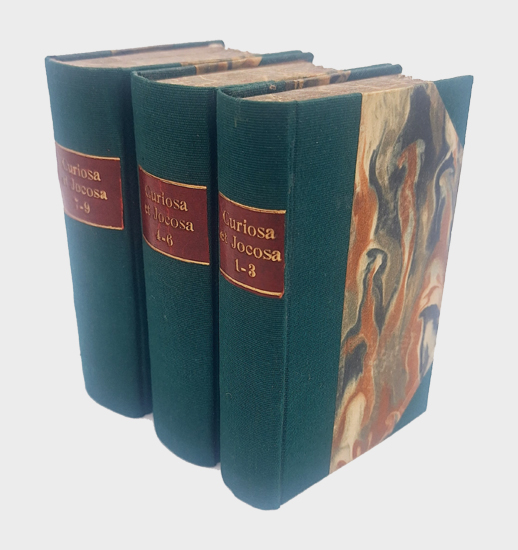 Curiosa et Jocosa, antiquaria et nova. Band 1 bis 9 (9 Ausgaben in 3 Bdn., so komplett). Verlag von J. Scheible, Stuttgart 1856-1857. 12°. Bd. 1-3: 144, 16; 80, 16; 144 S.; Bd. 4-6: 160, 10 teilkol. Kupfer; 208; 128 S.; Bd. 7-9: 128; 208; 128 S. Priv. Halbleinenbände mit goldgepr. Rückenschild.