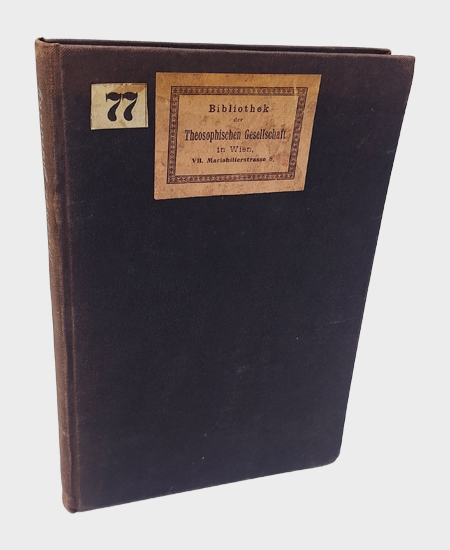 Exemplar aus der Bibliothek der Theosophischen Gesellschaft in Wien, eingebunden in den üblichen sehr stabilen u. robusten schwarzen Leineneinband mit Deckel–Schild. Etwas berieben und bestoßen. Innendeckel mit kl. Stempel, sonst gutes Exemplar.