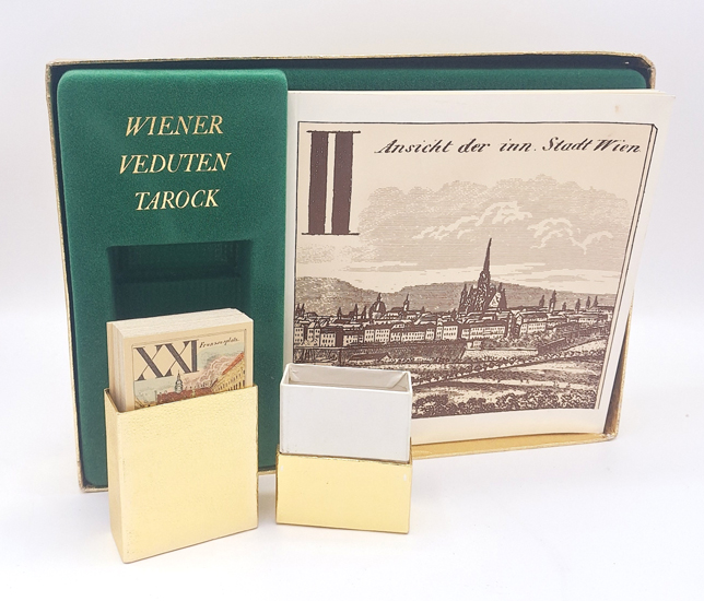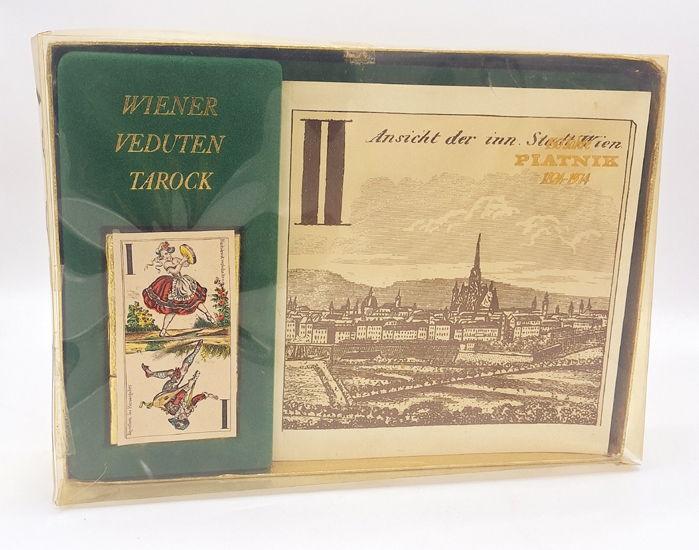 Gedanken zum Wiener Veduten Tarock. „Wien um 1870“. Verleger, Herausgeber und Druck Wiener Spielkartenfabrik Ferd. Piatnik & Söhne, Wien 1974. 23 Bl. 1 (w). Illustr. OKarton [200 x 190 mm] in Pappbox mit Kunstoffdeckel und dem „Tarock“ Deck [100 x 55 mm] in goldener Box.