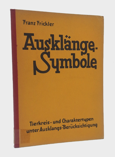 Frickler, Franz: Ausklänge-Symbole. Astrologisches Neuland. Tierkreis- und Charaktertypen unter Ausklangs-Berücksichtigung. Baumgartner-Verlag, Warpke-Billerbeck (Hann.) 1953. 3. Auflage. 213, [1], 12 S. Vlgs.-Anz. OKarton mit Geweberücken.