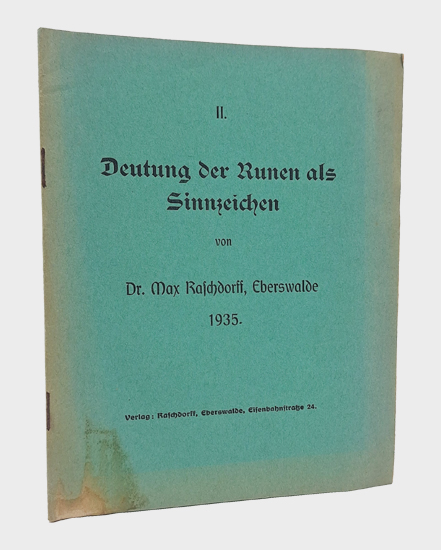 Raschdorff, Dr. Max: Deutung der Runen als Sinnzeichen. Verlag: Raschdorff, Eberswalde 1935. 2 Bl., 19, [1] w. S. OBroschur.