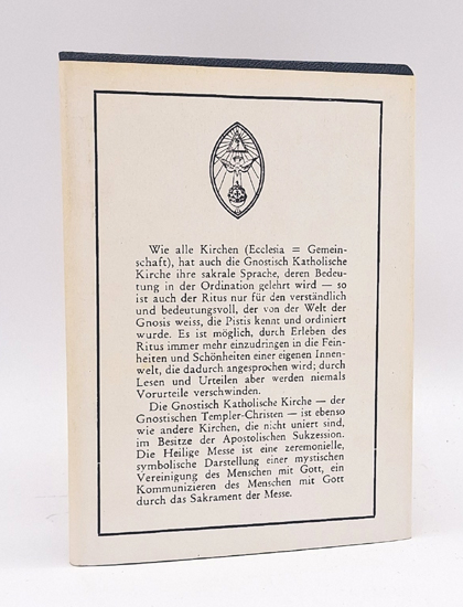Ecclesiae Gnosticae Catholicae Canon Missae. Verlag Psychosophische Gesellschaft, Zürich 1955. Kl.-8°. Deutsche Übertragung von Fra.·. Kâlîkânanda, Bendestorf, 15. / 16. Juli 1953, unter Berücksichtigung der Erstübertragung von Fra.·. Paragranus. [d.i. Hermann Joseph Metzger]. (Text in rot/schwarz gedruckt). 4 Bl. [unpaginiert = erstes Tit.-Bl. u. 3 Bl. (= S. 1-6)], 1 Bl. (w), 2 Bl. [unpaginiert = S. 7-10], S. 11-63 63 [auf “fein weiß holzfrei Bücherpapier Velin” gedruckt]. OLwd. mit goldgepr. Deckelillustration (Rosenkreuz) und Umschlag.