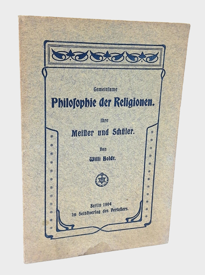 Boldt, Willi: Gemeinsame Philosophie der Religionen. Ihre Meister und Schüler. Im Selbstverlag des Verfassers, Berlin 1904. 32 S. OKarton.