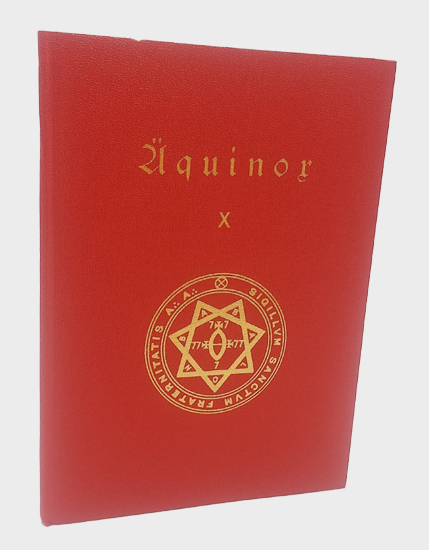 Äquinox X. Grimorium Sanctissimum – Liber XXV (Der Sternrubin), Liber XXXVI (Der Sternsaphir), Liber V vel Reguli. Verlag Psychosophische Gesellschaft, Schweiz 1959. 1 Bl., 42 Seiten, 2 Bl. Vlgs. Anz.. 1. Bl. Werkdruck in Kunstleder mit goldpr. und goldgepr. Sigill und OUmschlag.