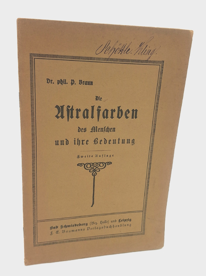 Die Astralfarben des Menschen und ihre Bedeutung. Verlag von F[riedrich] E[duard] Baumann, Bad Schmiedeberg (Bez. Halle) und Leipzig o.J. [1915]. Zweite Auflage. 21 , 3 S. Vlgs.-Anz. OKarton.