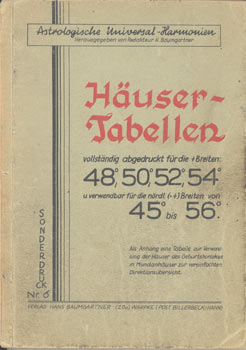 Häusertabellen vollständig abgedruckt für die +Breiten: 48°, 50°, 52°, 54° u. verwendbar für die nördl. (=+) Breiten von 45° bis 56°. Verlag Hans Baumgartner, Warpke o.J. (um 1950). 67 S., 15 S., 15 S. OKart.