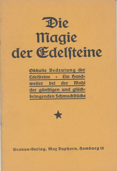 Die Magie der Edelsteine. Okkulte Bedeutung der Edelsteine. Ein Handweiser bei der Wahl der günstigen und glückbringenden Schmuckstücke. Uranus Verlag Max Duphorn, Hamburg o.J. (um 1928). 24 S., 4 Bl. Vlgs.-Anz. OKart.