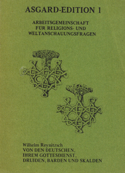 Reynitzsch, Wilhelm: Von den Deutschen, ihrem Gottesdienst, Druiden, Barden und Skalden. Arbeitsgemeinschaft für Religions- und Weltanschauungsfragen, München 1977. [1. Auflage]. Mit einem Vorwort von F. W. Lehmberg. 148 S. illustr. OKarton.