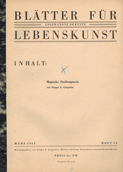 Blätter für angewandte okkulte Lebenskunst. März 1951 – [Heft 12]. Herausgegeben (als Privatdruck) von Gregor A. Gregorius. Meister der Loge Fraternitas Saturni Orient Berlin, Berlin 1951. 4°. 1 Bl. (Deckblatt m. Titel), 11 S. Typoskriptdruck mit Klammerheftung und Fälzelstreifen.