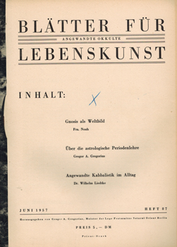 Blätter für angewandte okkulte Lebenskunst. Juni 1957 – [Heft 87]. Herausgegeben (als Privatdruck) von Gregor A. Gregorius. Meister der Loge Fraternitas Saturni Orient Berlin, Berlin 1957. 4°. 1 Bl. (Deckblatt m. Titel), 17 S., 1 (w) Typoskriptdruck mit Klammerheftung und Fälzelstreifen.