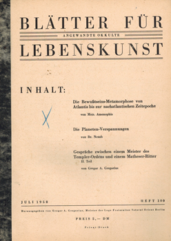 Blätter für angewandte okkulte Lebenskunst. Juli 1958 – [Heft 100]. Herausgegeben (als Privatdruck) von Gregor A. Gregorius. Meister der Loge Fraternitas Saturni Orient Berlin, Berlin 1958. 4°. 1 Bl. (Deckblatt m. Titel), 20 S. Typoskriptdruck mit Klammerheftung und Fälzelstreifen.
