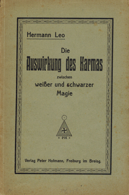 Leo, Herman: Die Auswirkung des Karmas zwischen weißer und schwarzer Magie mit einer leichtfasslichen Eiführung in die Technik der Astrologie, dargestellt an zwei Lebensspiegeln (Horoskopen).. Verlag Peter Hofmann, Freiburg im Breisg. 1921. 80 S. illustr. OKarton.