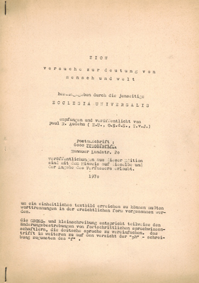 Zion. Versuche der Deutung von Mensch und Welt. Privatdruck (Typoskript) Paul R[üdiger] Audehm, Frankfurt am Main 1970. 4°. 20 geklammerte Blätter.