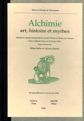 Kahn, Didier und Matton, Sylvain: Alchimie art, histoire et mythes. S.É.H.A., Paris 1995. Gr.-8°. Actes du 1er colloque international de la Société d’Étude de l’Histoire de l’Alchimie (Paris, Collège de France, 14-15-16 mars 1991). VI, 847 S., 1 (w) priv. HLwd. mit montiertem OKarton.