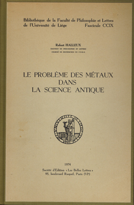 Halleux, Robert: Le problème des métaux dans la science antique. Les Belles Lettres, Paris 1974. Gr.-8°. 236 S., 1 Bl., 16 S., 1 Bl. priv. Lwd. mit montiertem OKarton.