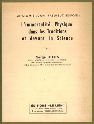 Hutin, Serge: L’immortalité Physique dans les Traditions et devant la Science. Éditions “Le Lien” Michel Ebener, Strasbourg 1972. 4°. 1 Bl., 151 S. priv. Lwd. mit montiertem OKarton.