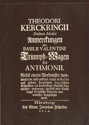 Anmerckungen über Basilii Valentini Triumph-Wagen des Antimonii. Nebst einem Vorbericht / worinnen ein und anders / was in Basilii und andern dergleichen spagyrischen Schriften / zu beobachten / dienlich seyn möchte / angezeigt / zu End aber Kerckrings lateinische Vorrede verteutscht / beygefüget wird. Verein für Biologische Grundlagenforschung, Affoltern o.J. [1975]. 4° quer. Herausgegeben von Franz Baumberger. 330 S. (Spalten), 6 Bl. Register (20 Spalten) OKarton.