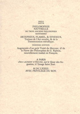 Arthéphius: Le livre secret du très ancien philosophe Artéphius traitant de l’art occulte & de la pierre philosophale. Editions DGC, Pantin 1990. 4°. 33 Bl. (Français), XXXI Bl. (Latin), 1 Bl. (lose) Blätter im OPappschuber (auch) im OPappschuber.