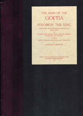 Crowley, A(leister) (eigentl.: Edward Alexander C.): The Book of the Goetia of Solomon the King. Hell Fire Club, o.O. u. O.J. [United Kingdom 2004]. 4°. 3 Bl., ix, 1 Bl., vii-ix, 65 S., 2 Bl. OHLdr. mit montierten Deckelschild.