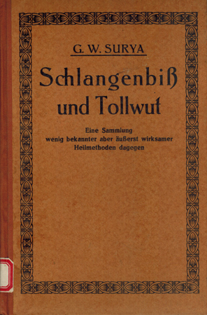 Surya, G. W. (Ps) = Demeter Georgiewitz Weitzer: Schlangenbiß und Tollwut. Eine Sammlung wenig bekannter äusserst wirksamer Heilmethoden dagegen. Verlag von Karl Rohm, Lorch (Württemberg) 1929. Zweite, erweiterte Auflage. 163 S., 2 Bl. Vlgs.-Anz. OHLwd.