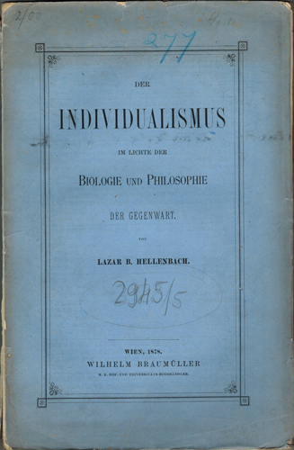 Hellenbach, Lazar B[aron]: Der Individualismus im Lichte der Biologie und Philosophie der Gegenwart. Wilhelm Braumüller, Wien. 1878. Gr.-8°. VIII, 272 S. Okarton.