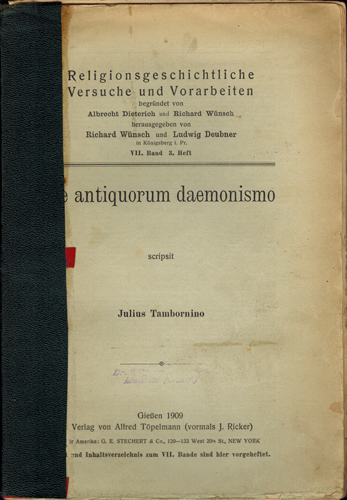 Tambornino, Julius: De antiquorum daemonismo. Verlag von Alfred Töpelmann (vormals J. Ricker), Gießen 1909. 2 Bl., 110 S. OBroschur.