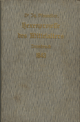 Pfaundler, Dr. Ignaz: Ueber die Hexenprozesse des Mittelalters mit spezieller Beziehung auf Tirol. Nebst Anhang die aktenmäßige Darstellung eines sehr interessanten Hexenprozesses vom Jahr 1680 enthaltend. Karl Pfaundler, Innsbruck 1843. 1 (w), 1 (Titelblatt), 63 S. 2 (w) priv. Leinen der Zeit mit Deckelgoldprägung.