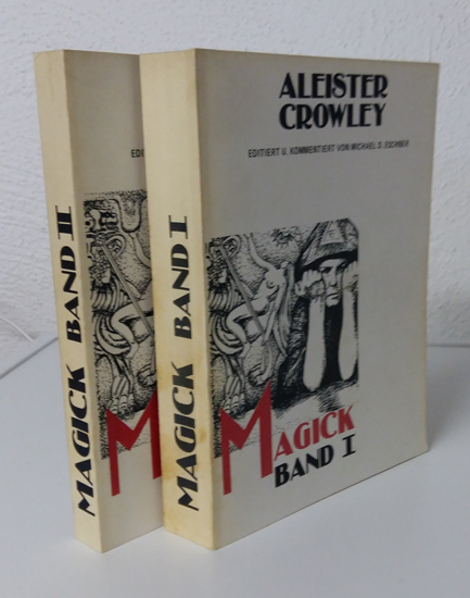 Crowley, Aleister (eigentl.: Edward Alexander C.): Magick. Band I & Band II. “Stein der Weisen” Johanna Bohmeier & Co. Verlag & Versand, Clenze 1986. 5. überarbeitete Auflage. Editiert und kommentiert [u. teilw. übersetzt] von M[ichael] D[ietmar] Eschner. 545 S., 7 Bl. Vlgs.-Anz.; 364 S., 6 Bl. Vlgs.-Anz., 1 [w] illustr. OKarton Bände.