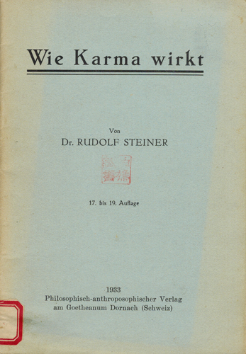 Steiner, Rudolf: Wie Karma wirkt. Philosophisch-Anthroposophischer Verlag am Goetheanum, Dornach (Schweiz) 1933. 17. bis 19. Auflage. 46 S., 1 [w] OBroschur.