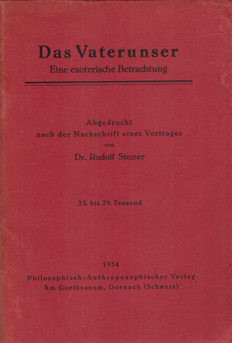 Das Vaterunser. Eine esoterische Betrachtung. Philosophisch-Anthroposophischer Verlag am Goetheanum, Dornach (Schweiz) 1934. 25. bis 29. Tausend. 48 S. OKarton.