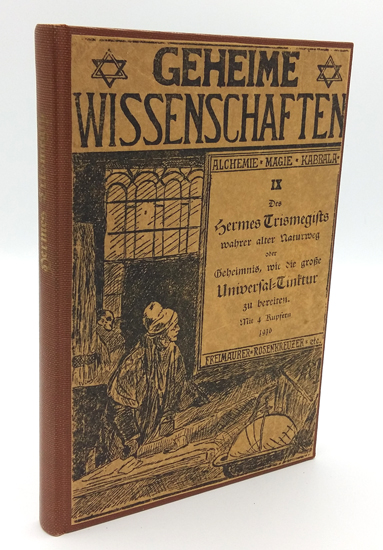 Geheime Wissenschaften. Eine Sammlung seltener älterer und neuerer Schriften über Alchemie, Magie, Kabbalah, Rosenkreuzerei, Freimaurerei, Hexen- und Teufelswesen etc. Unter Mitwirkung namhafter Autoren herausgegeben von A. v. d. Linden. Neunter Band. Originalgetreue Facsimile-Ausgabe (der Ausgabe) Leipzig, bey Adam Friedrich Böhme 1782. Hergestellt für Hermann Barsdorf Verlag durch Conrad Paris, Berlin im Jahre des Weltkrieges 1915. – Ackermann IV, 86. Brüning 5959 (Ausgabe 1920). Zur Ausgabe von 1782 siehe Ferguson I, S. 358; J. Neu 1796; Kopp II, S. 366; Schmieder S. 28 (5); Caillet 5100; Miers S. 287; Wolfstieg 43024. Zu Hermes Trismegistos siehe Biedermann S. 202, Roberts S. 314; ausführlich bei Bachmann/Hofmeier (Geheimnisse der Alchemie) S. 22 ff.; Priesner/Figala S.173-176. Nummerierte “Vorzugsausgabe” einer kleinen Auflage auf besserem Papier. Dieses Exemplar trägt die Nummer 82. – Ein sehr gutes Exemplar.