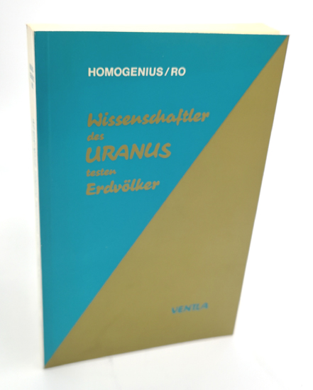 Homogenius / Ro: Wissenschaftler des Uranus testen Erdvölker. Zwei auf der Erde gelandete Uranier übermitteln Vorschläge an die Erdenmenschheit. Telepathisch niedergeschrieben von P.Leopold. Ventla-Verlag, Wiesbaden 1974. 162 S., 1 (w) OKarton.