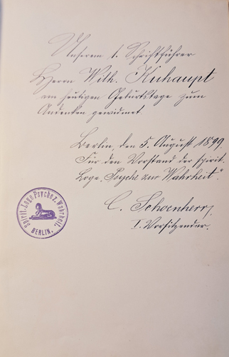 Ackermann II, 466. Miers S. 683. Zu Zöllner vgl. Bonin S. 549. Fodor S. [416]. Miers S. 683-684. Shepard, Vol. 2, S. 1012. Tischner “Geschichte der Parapsychologie”. – Exemplar leicht berieben, Ecken und eine kl. Stelle am Rücken etwas stärker. Das 2 w. Blatt gestempelt: “Spirit. Loge Psyche z. Wahrheit, Berlin” und mit mehrzeiliger handschriftl. Widmung des 1 Vorsitzenden der Loge “C. Schoenherr” an Herrn Wilh. Kuhaupt.