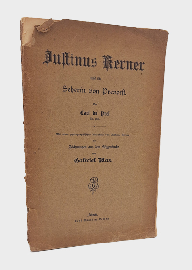 Du Prel, [Freiherr] Dr. Carl: Justinus Kerner und die Seherin von Prevorst. Ernst Günthers Verlag, Leipzig o.J. [1886]. Gr.-8°. Mit einer photographischen Aufnahme von Justinus Kerner und Zeichnungen aus dem Skizzenbuche von Gabriel Max. 37 S., 1 Bl. (Anzeigen). OKarton.