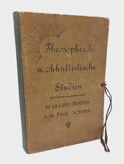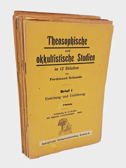 Schmidt, Ferdinand: Theosophische und okkultistische Studien in 12 Lehr-Briefen. Fickers Verlag (überklebt mit Rudolph’sche Verlagsbuchhandlung, Dresden-A.), Leipzig o.J. [1904]. 381 S., 1 Bl. 12 Broschuren in Leinenmappe.