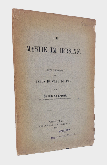 Specht, Gustav: Die Mystik im Irrsinn. Erwiderung an Baron Dr. Carl du Prel. Verlag von J. F. Bergmann, Wiesbaden 1891. Gr.-8°. VI, 1 Bl. (Inhalt), 127 S. OKarton.