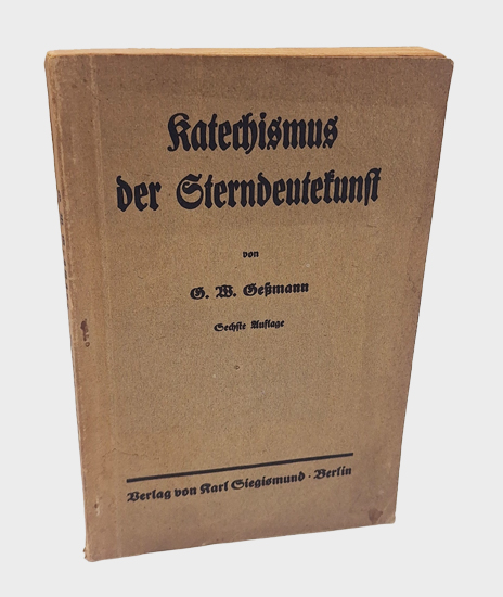 Geßmann, G(ustav) W(ilhelm): Katechismus der Sterndeutekunst das ist die Lehre aus den Gestirnkonstellationen Schlüsse auf irdische Vorgänge zu ziehen. Eine nach alten und neuen Quellen gemeinverständlich bearbeitete kulturgeschichtliche Studie. Verlag von Karl Siegismund, Berlin [1923]. 6. erw. Aufl. Mit 5 Fig. u. 10 schematischen Tab. 159 S. OKart.