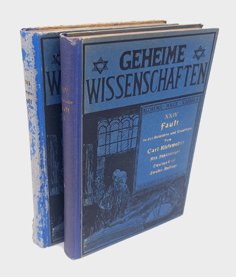 Kiesewetter, Carl: Faust in der Geschichte und Tradition. Mit besonderer Berücksichtigung des okkulten Phänomenalismus und des mittelalterlichen Zauberwesens. Als Anhang: Die Wagnerfrage und das Wagnerbuch. 2 Bände mit etwa 40 zum Teil farbigen Abbildungen. Hermann Barsdorf Verlag, Berlin 1921. XVII, 258 S.; XI, 311 S. illustr. blaue OHLwd. Bde.