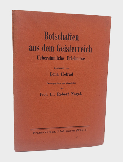 Botschaften aus dem Geisterreich. Uebersinnliche Erlebnisse. Prana-Verlag, Pfullingen (Württ.) 1921. 3.-5. Auflage. Herausgegeben und eingeleitet von Prof. Dr. Robert Nagel (Wien). 48 S. OKarton.