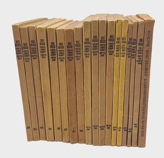 Das Reich. Vierteljahresschrift (ab April 1920 Zweimonatsschrift). 1. Jahr bis 5. Jahr (in 18 Heften, so komplett [= alles erschienene]). Hans Sachs-Verlag, München April 1916 bis April/Juli 1920. Gr.-8°. 1 Jg.: 631, [1], 12 Bl.; 2 Jg.: 792, 6 Bl.; 3 Jg.: 627, [1], 8 Bl.; 4 Jg.: 560, 4 Bl.; 5 Jg.: 205 S., 1 Bl. OKarton Bände.