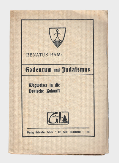 Renatus Ram (Ps.) = Paul Wilhelm Albert Köthner: Godentum und Judaismus. Wegweiser in die Deutsche Zukunft. Verlag Gesundes Leben Dr. Hotz, Rudolstadt 1921. Gr.-8°. Geleitwort von Alexander Graf Kielmansegg. 154 S., 11 Bl. OKarton.